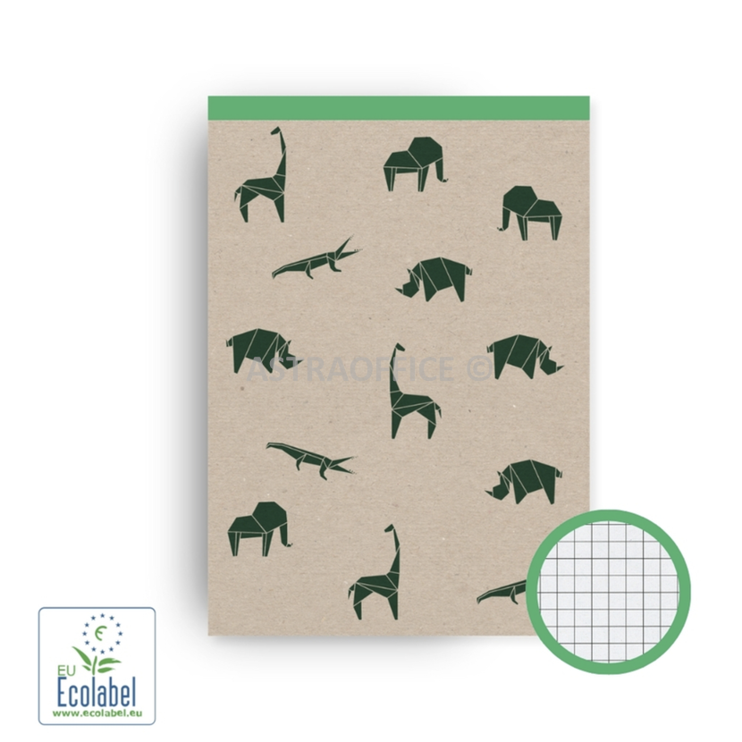 Univerzální čtverečkovaný blok z recyklovaného papíru s perforací, sešitý skobami na kratší straně.