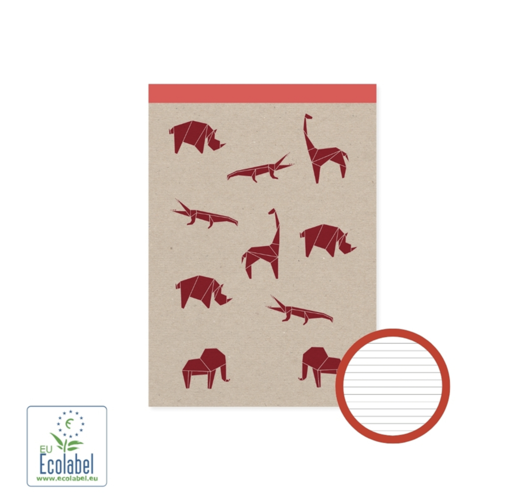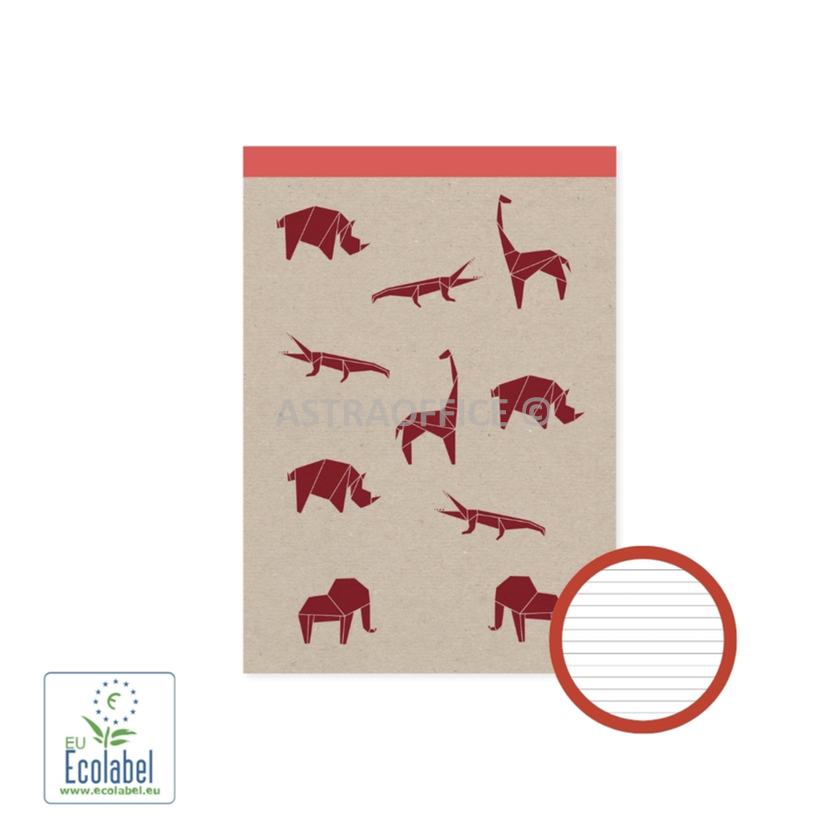 Univerzální linkovaný blok z recyklovaného papíru s perforací, sešitý skobami na kratší straně.