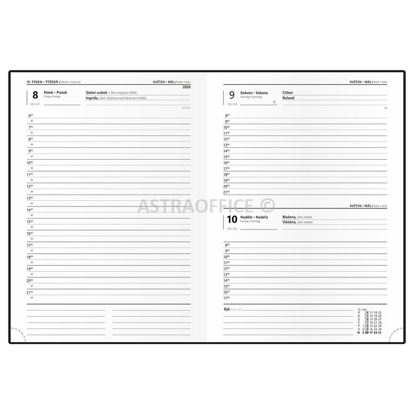 Denní diář formátu B6 je vyráběný z matného hladkého lamina s parciálním lakem, který dodává každému diáři šmrnc. Jedná se nejen o skvělý doplněk, ale také si budete moci efektivněji plánovat Váš čas. Navíc se tento oblíbený formát pohodlně vejde do každé tašky či kabelky., tištěná grafika potažená nepoškrabatelným matným laminem s parciálním lakem, jednostranná pěnová výplň, šitá vazba V8, stužka, kapitálky, perforované rožky, vlepená kapsa, ofset, 70g/m2, Kalendárium: Denní, Počet stran: 336, Formát: B6, Rozměry: 120x165