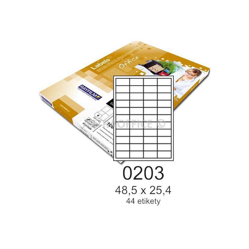 Rayfilm Office etikety jsou papírové etikety určené pro potisk ve všech typech tiskáren a kopírek. Ať už potřebujete cokoli označit, zvýraznit, prostě nalepit stačí zvolit jeden ze širokého sortimentu materiálů a rozměrů Office etiket. Řada OFFICE v sobě zahrnuje široký sortiment papírových etiket pro potisk v laserových a inkoustových tiskárnách, nebo kopírkách. V sortimentu naleznete etikety , které použijete nejen v kanceláři, ale také v domácnosti a běžném životě. Počínaje standardními bílými etiketami, přes etikety s odnímatelným - přemístitelným lepidlem, barevné etikety, fluorescentní etikety a lesklé etikety. V řadě Office naleznete vše co potřebujete pro Váš malonákladový tisk etiket.