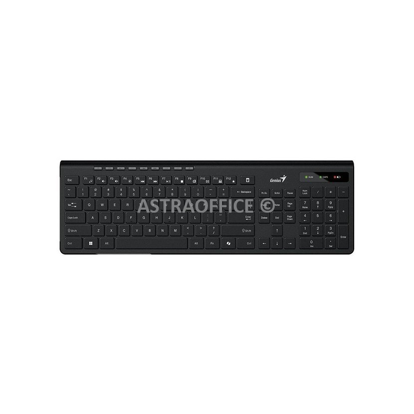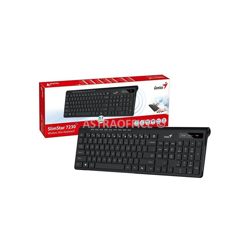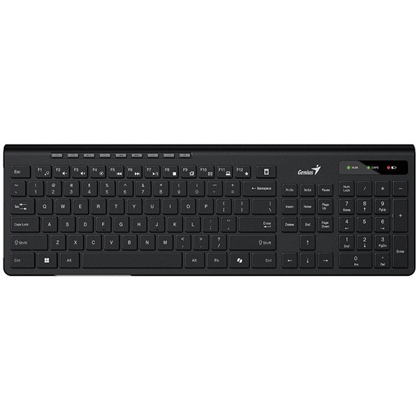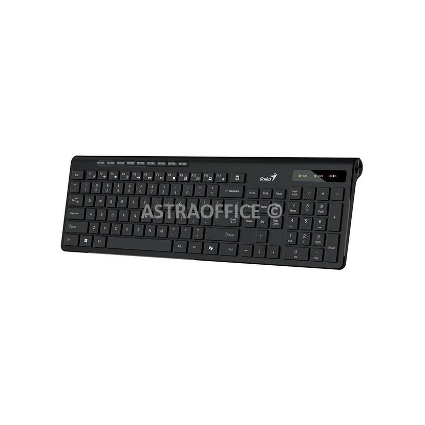 Genius Slimstar 7230 CopilotBezdrátová klávesnice je navržena tak, aby uživateli poskytla maximální komfort při každodenní práci. Ergonomický sklon společně s klávesami typu chiclet umožňuje efektivní a pohodlné psaní. Klávesnice je vybavena samostatnou klávesou pro vyvolání AI asistenta Microsoft Copilot v systému Windows. Připojení je realizováno skrze technologii 2,4 GHz a miniaturní USB přijímač. Napájení má na starost jedna AA baterie, která je součástí balení.Základní specifikace: .popisTabulka td { border: 1px solid #252424; min-width: 5rem;padding: 0.15rem 0.35rem; } .popisTabulka tr:nth-of-type(2n) { background-color: #e3e9eb; } Typ klávesnice:nbsp; membránová Typ připojení:nbsp; 2,4 GHz (mini USB adaptér)Typ kláves:nbsp;chicletMultimediální klávesy:nbsp;AnoPodsvícení:NeLayout:CZ/SKNapájení:1 x AA (součástí balení)Barva:černáRozměr:440 × 141,3 × 30 mmHmotnost:453 g nbsp;nbsp;
