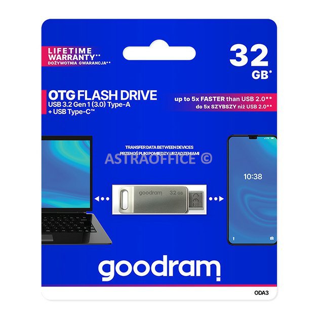 Goodram USB 3.0 flash disk OTG - ODA3 USB disk umožňuje používat jednu jednotku USB s různými stolními a mobilními zařízeními. Díky konektorům USB A a USB C vám tento OTG USB pomůže přenášet data mezi stolními počítači a nejnovějšími mobilními telefony a tablety Specifikace: Dostupné kapacity: 16GB, 32GB, 64GB, 128GB Barva těla: stříbrné, celokovové Rychlost čtení: až 60 MB/s Rychlost zápisu