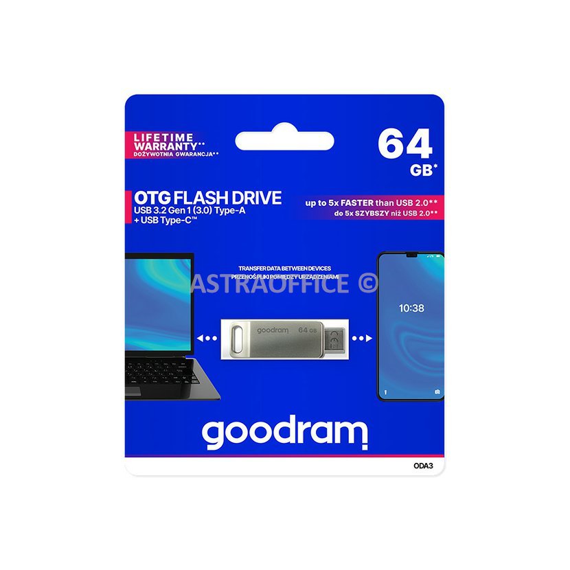 Goodram USB 3.0 flash disk OTG - ODA3 USB disk umožňuje používat jednu jednotku USB s různými stolními a mobilními zařízeními. Díky konektorům USB A a USB C vám tento OTG USB pomůže přenášet data mezi stolními počítači a nejnovějšími mobilními telefony a tablety Specifikace: Dostupné kapacity: 16GB, 32GB, 64GB, 128GB Barva těla: stříbrné, celokovové Rychlost čtení: až 60 MB/s Rychlost zápisu