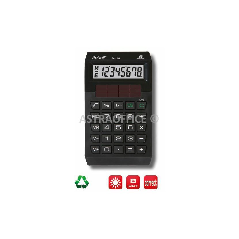 Rebell Eco 10 je kapesní kalkulátor šetrný k životnímu prostředí. 100% solární napájení a je vyroben ze 70%z recyklovaných plastů. Díky těmto vlastnostem získal certifikát Der Blaue Engel.•4 paměťové klávesy •odmocnina •neobsahuje žádné baterie •rozměry: 120 × 72 × 15 mm •hmotnost: 52 g