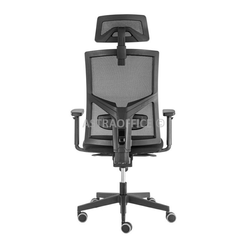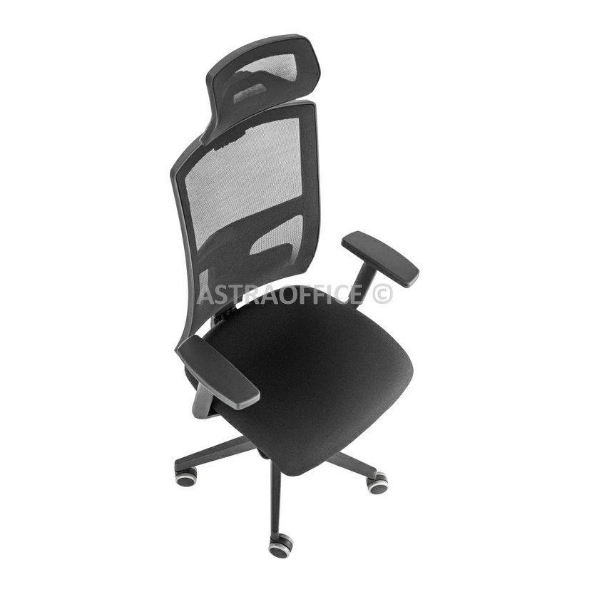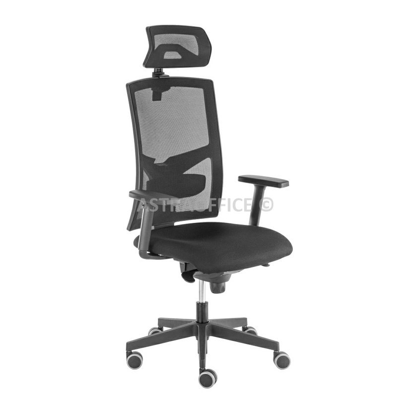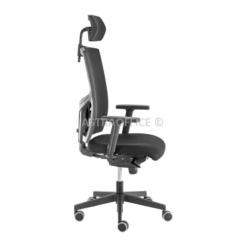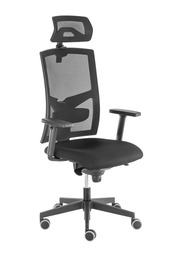 Elegantní velmi pohodlná kancelářská židle s vysokým opěrákem vhodným také pro vysoké postavy. Základem židle je kvalitní synchronní mechanika s blokací v 5 polohách a nastavením tuhosti přítlaku zad. Vysoký síťovaný opěrák je výškově nastavitelný pomocí mechanického zámku, součástí je pružná a výškově nastavitelná čalouněná bederní opěrka pro optimální oporu zad. Velmi pohodlný síťovaný podhlavník je výškově i úhlově nastavitelný. ● kvalitní potahová látka Bondai 8033 černá, 150.000 cyklů ● synchronní mechanika s blokací v 5 polohách, nastavení tuhosti přítlaku zad ● výškově stavitelný síťovaný opěrák s mechanickým zámkem ● výškově stavitelná bederní podpěra ● výškově a úhlově stavitelný síťovaný podhlavník ● výškově stavitelné područky s měkčeným topem ● nylonový černý kříž LOOP ø 640 mm ● univerzální velká pogumovaná kolečka ø 65 mm ● nosnost 150 kg ● záruka 5 let ● certifikovaný český výrobek dle ČSN EN 1335