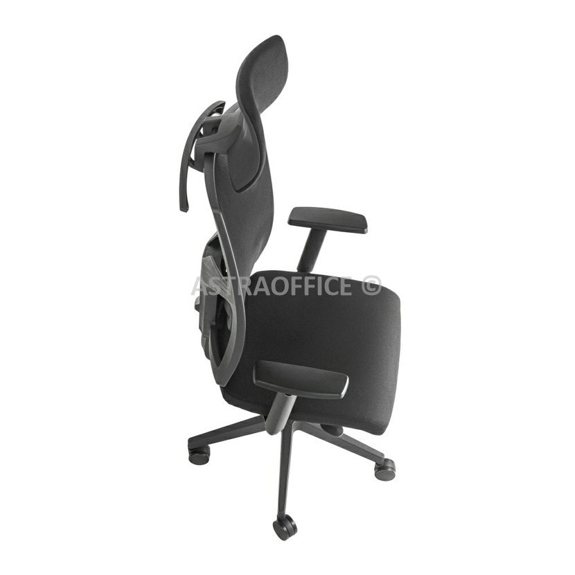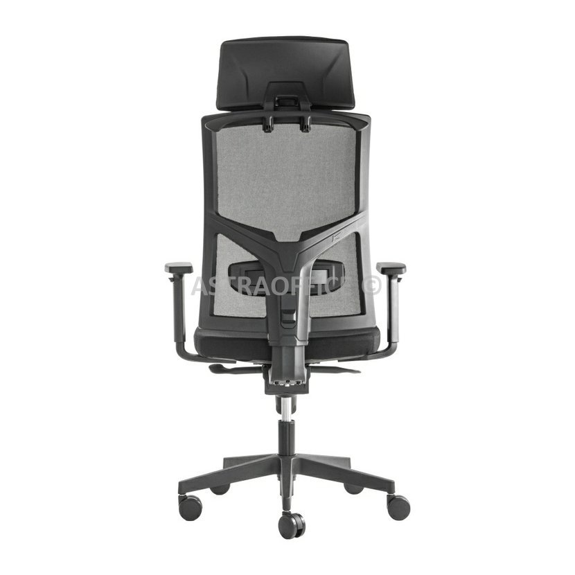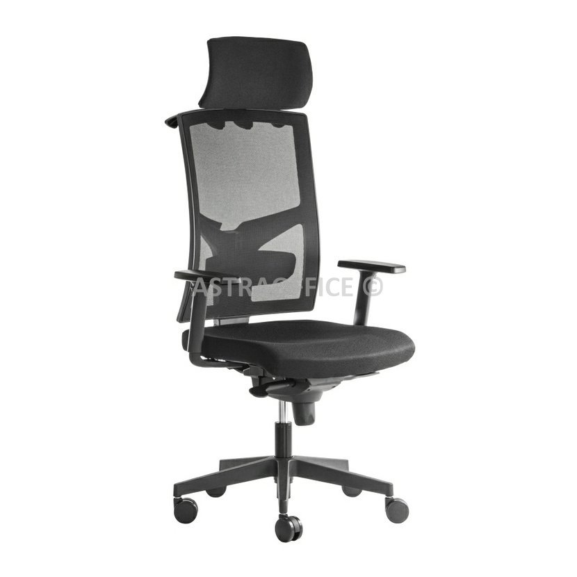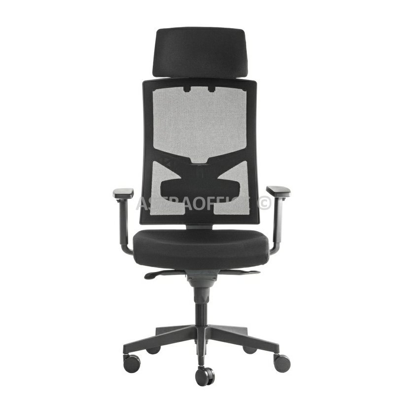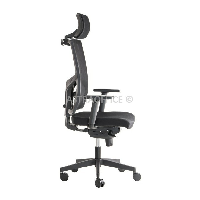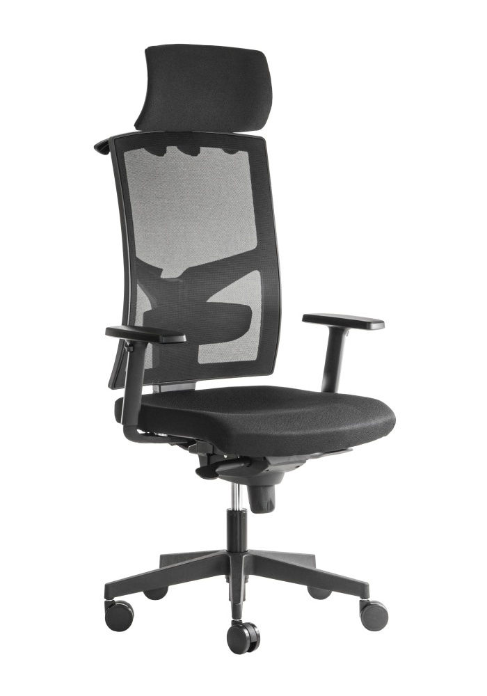 Exkluzivní designová židle pro velmi pohodlné sezení s čalouněným podhlavníkem a praktickým ramínkem na šaty. Model vhodný také pro vysoké postavy. Základem židle je kvalitní synchronní mechanika s blokací v 5 polohách a nastavením tuhosti přítlaku zad. Výplň sedáku je z kvalitní injektované pěny s vysokou odolností vůči prosezení. Vysoký síťovaný opěrák je výškově nastavitelný pomocí mechanického zámku, součástí je pružná a výškově nastavitelná čalouněná bederní opěra pro optimální oporu zad. kvalitní potahová látka Bondai 8033 černá, 150.000 cyklů vysoce odolná injektovaná polyuretanová pěna v sedáku prošité hrany čalounění synchronní mechanika s blokací v 5 polohách, nastavení tuhosti přítlaku zad výškově stavitelný síťovaný opěrák s mechanickým zámkem výškově stavitelná bederní podpěra pevný čalouněný podhlavník ramínko na šaty výškově stavitelné područky s měkčeným topem nylonový černý kříž LOOP ø 640 mm velká pogumovaná kolečka ø 65 mm nosnost 150 kg, záruka 5 let certifikovaný český výrobek dle ČSN EN 1335