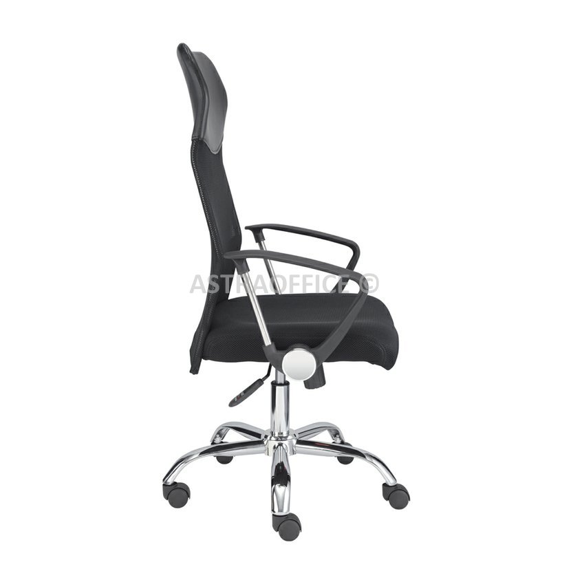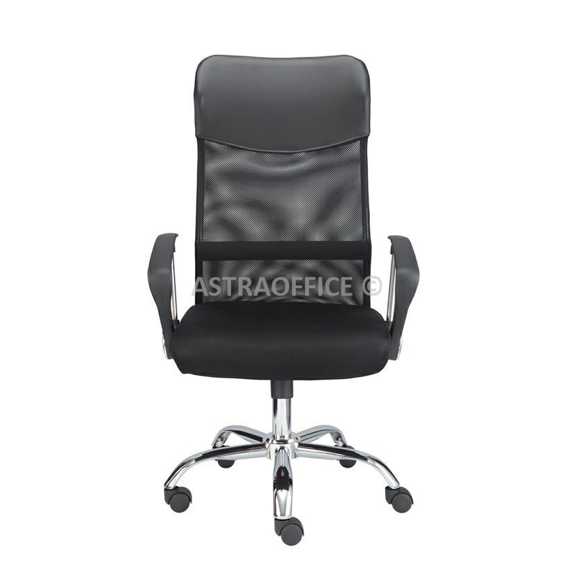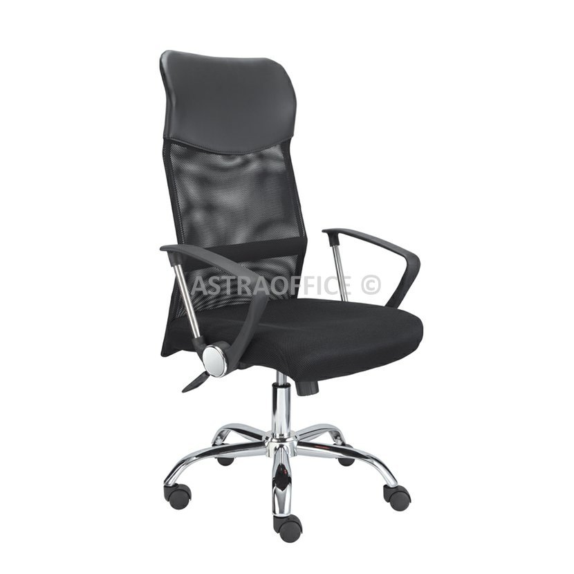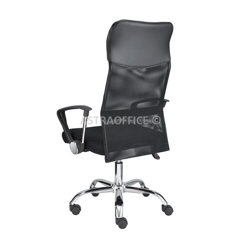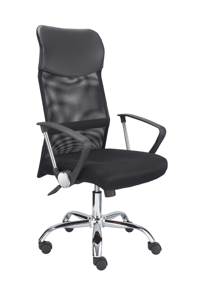 Kancelářská židle MEDEA je vhodná pro občasné sezení do firem a domácností. Základem židle je mechanika umožňující houpání sedícího a aretaci v základní pracovní poloze, to vše pomocí jedné páčky. Součástí židle je čalouněný sedák v prodyšném potahu MESH, vysoký síťovaný opěrák s integrovanou hlavovou opěrkou v černé kožence, pevné chromové područky s plastovou dotykovou částí, ocelový chromový kříž s chromovým pístem. Plastová kolečka pro kobercové povrchy. ● potahová látka MESH černá ● houpací mechanika s blokací v základní poloze, nastavení tuhosti přítlaku zad ● vysoký síťovaný opěrák s čalouněnou hlavovou částí ● pevné chromové područky s plastovým topem ● ocelový chromový kříž ø 640 mm, chromový píst ● malá plastová kolečka ø 50 mm ● nosnost 120kg ● záruka 2 roky