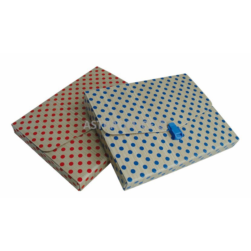 Novinka od tradičního českého výrobce v netradičním provedení odnosného pevného kufříku se vzorem puntíku v modré, či červené barvě, velice pevná archivní lepenka LUXOR vhodná pro dlouhodobou archivaci, kufřík má rozměr 325x251x35 mm pro vkládání dokumentů do rozměru A4, je opatřen uzavírací plastovou sponou rovněž v barvě kufříku.