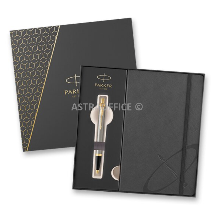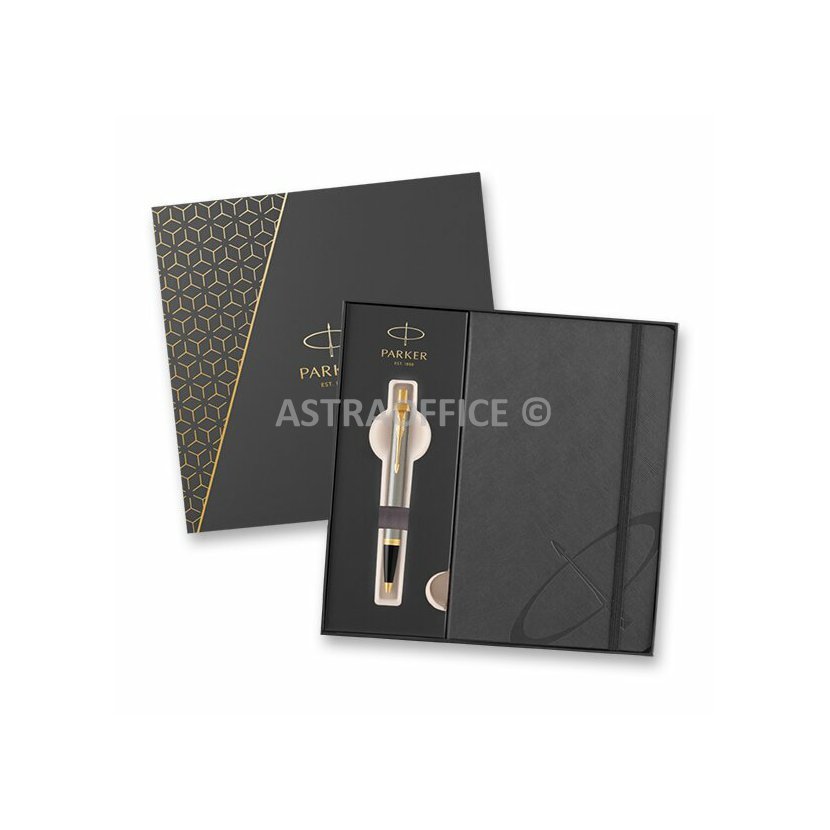 Sada obsahuje zápisník v šedé barvě a kuličkové pero Parker IM Brushed Metal s broušeným mosazným tělem a lakovanou povrchovou úpravou. V kombinaci s doplňky pokovenými zlatem, s leštěnou úpravou. Dodáváno v dárkové kazetě se zápisníkem.