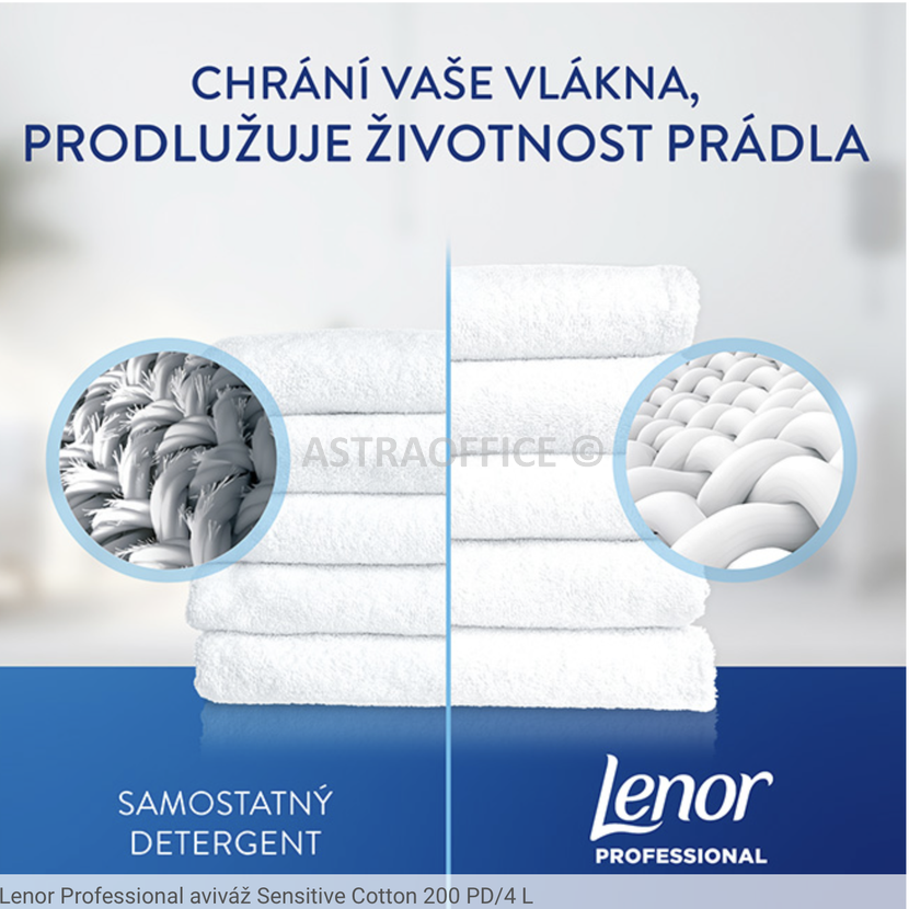 Aviváž Lenor Professional Sensitive Cotton je vyvinutá tak, aby prodlužovala životnost prádla a zároveň mu zajistila dlouhotrvající svěžest a hebkost. Speciální formule pro profesionální použití používá silnější aktivní složky. Obsahuje technologii zjemňování, která chrání vlákna před poškozením. Pomáhá tak prodloužit životnost prádla a šetří peníze za nákup nového. Zanechává na prádle parfémové mikro kapsle, které se třením postupně uvolňují a dodávají mu dlouhotrvající vůni. Díky difúzní technologii se vůně z prádla uvolňuje postupně a zanechává jej dlouhodobě svěží i po sušení v sušičce. Redukuje výskyt statické přilnavosti na tkanině.
