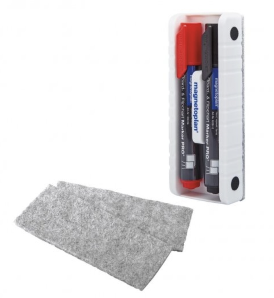 Start sada Magnetoplan BASIC. Obsahuje: magnetickou stěrku s černým a červeným popisovačem v plastovém těle stěrky. Stěrka s filcem tloušťky 5 mm.