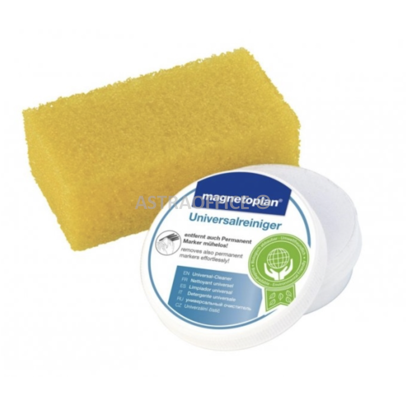 Speciální, velmi účinný čistící prostředek na bílé magnetické tabule. Čistí zbytky stop za sucha stíratelných popisovačů. Odstraní z povrchu bílé tabule i stopy permanentního popisovače. Prostředek Magnetoplan Universal je vyroben na bázi přírodních materiálů a je šetrný k životnímu prostředí. Aplikuje se s dodávanou navlhčenou houbičkou. Poté se setře povrch do sucha.
