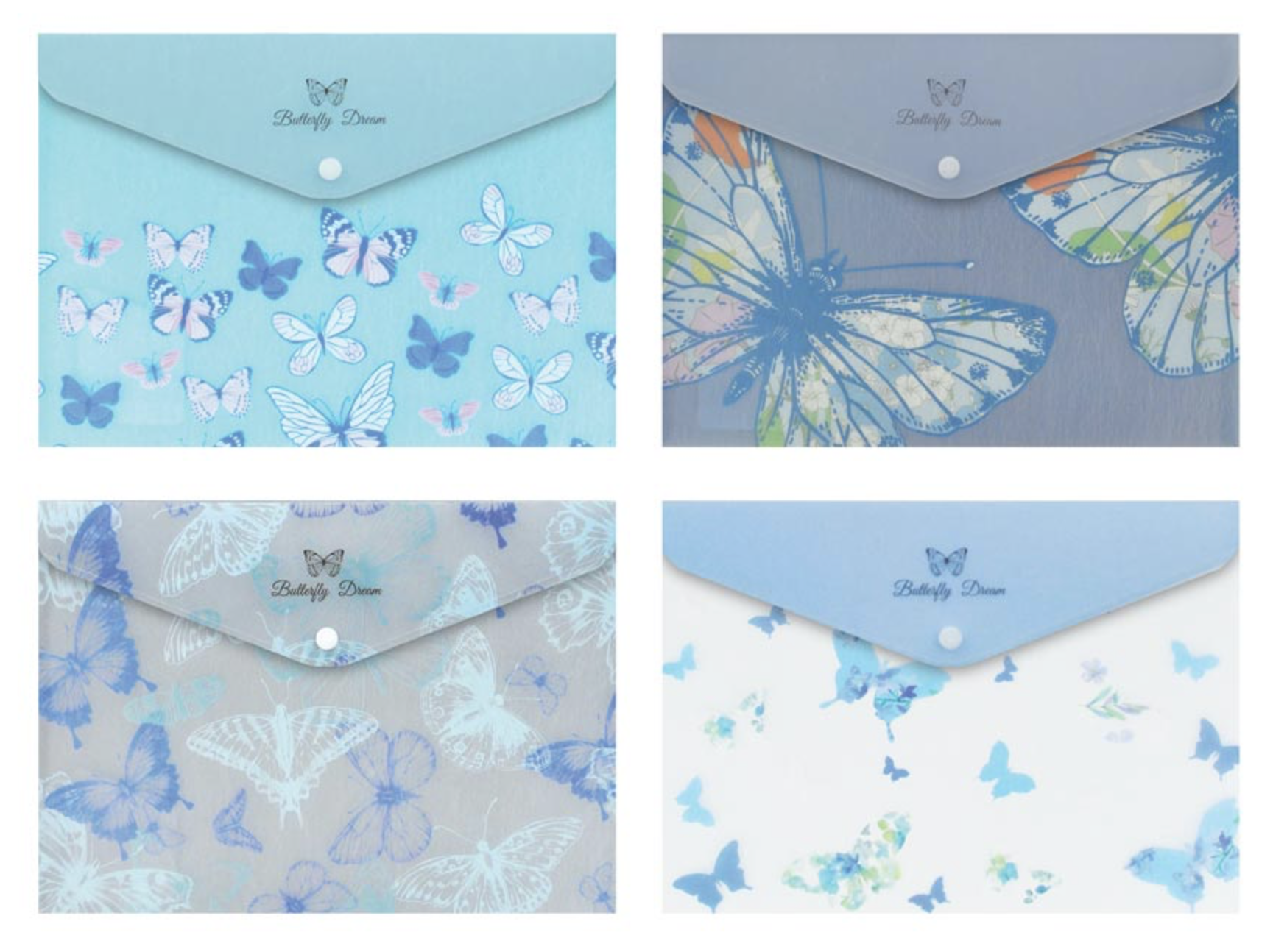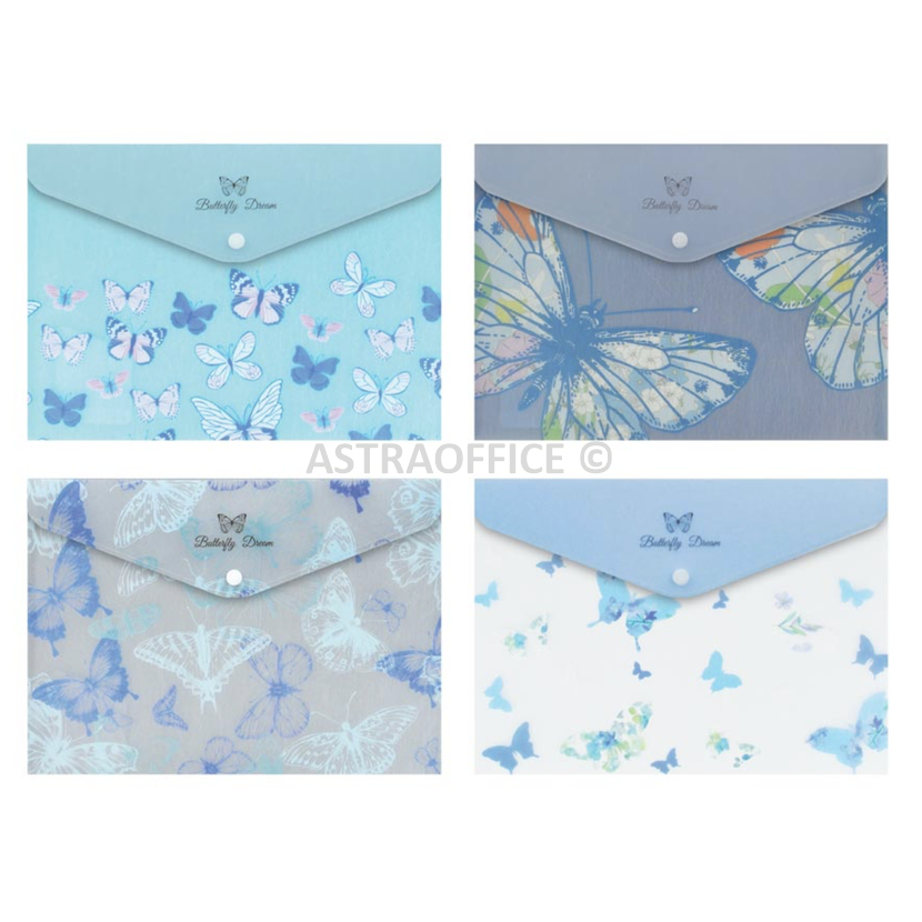 Lehká plastová složka s jemným motivem modrých motýlů pro ukládání dokumentů, sešitů nebo volných papírů formátu A4. Zapínání na druk pomáhá udržet obsah bezpečně pohromadě a zároveň usnadňuje každodenní používání doma, ve škole i v kanceláři. Složka je praktická, přehledná a díky jemnému designu působí příjemně.