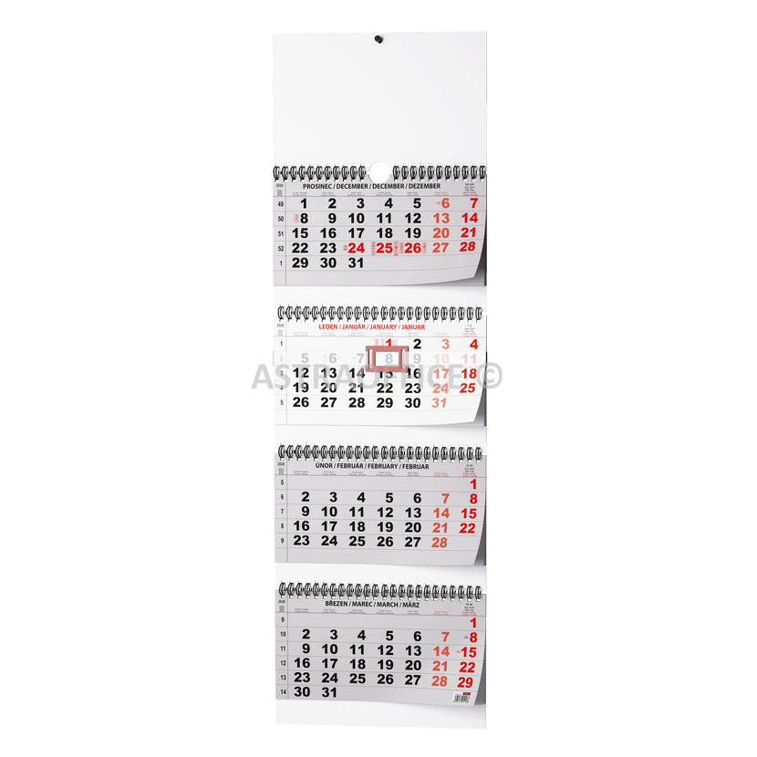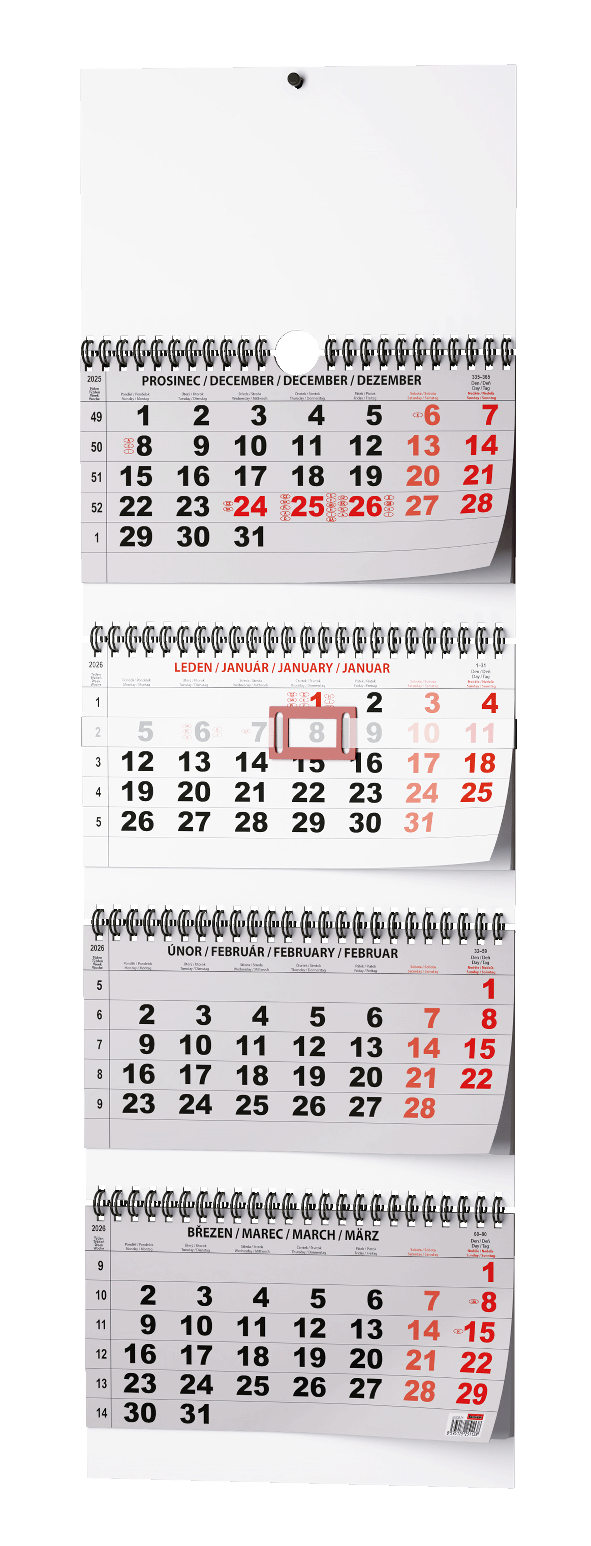 Praktický skládací nástěnný kalendář se čtyřměsíčním kalendáriem a posuvným jezdcem vhodný do Vaší kanceláře., Papír: ofset, 100 g/m2 Karton je z kvalitní bílé lepenky Součástí je posuvný jezdec z laminovaného papíru, dvojitá kovová spirála "twin wire" s háčkem pro zavěšení Složený kalendář má rozměry 292×180 mm, Kalendárium: Měsíční české, Počet listů: 48, Rozměry: 292x900