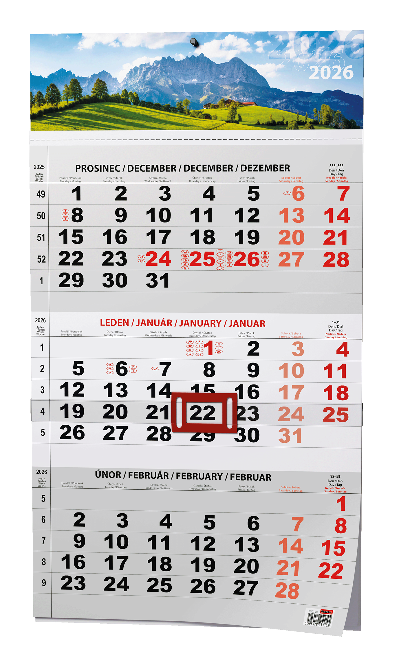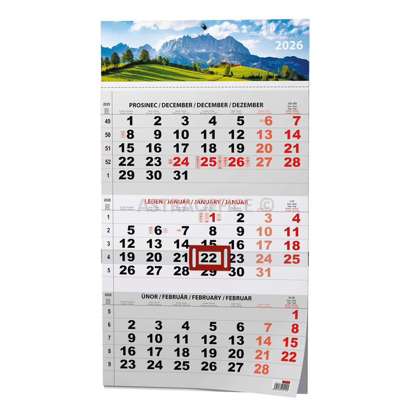 Praktický nástěnný kalendář s tříměsíčním kalendáriem s barevnou laší s motivem přírody a s posuvným jezdcem vhodný do Vaší kanceláře., Papír: ofset, 100 g/m2 Karton je z kvalitní bílé lepenky, horní karton je přišitý ke kalendáriu skobičkami Součástí je posuvný jezdec z laminovaného papíru, Kalendárium: Měsíční české, Počet listů: 12, Formát: A3, Rozměry: 292x420