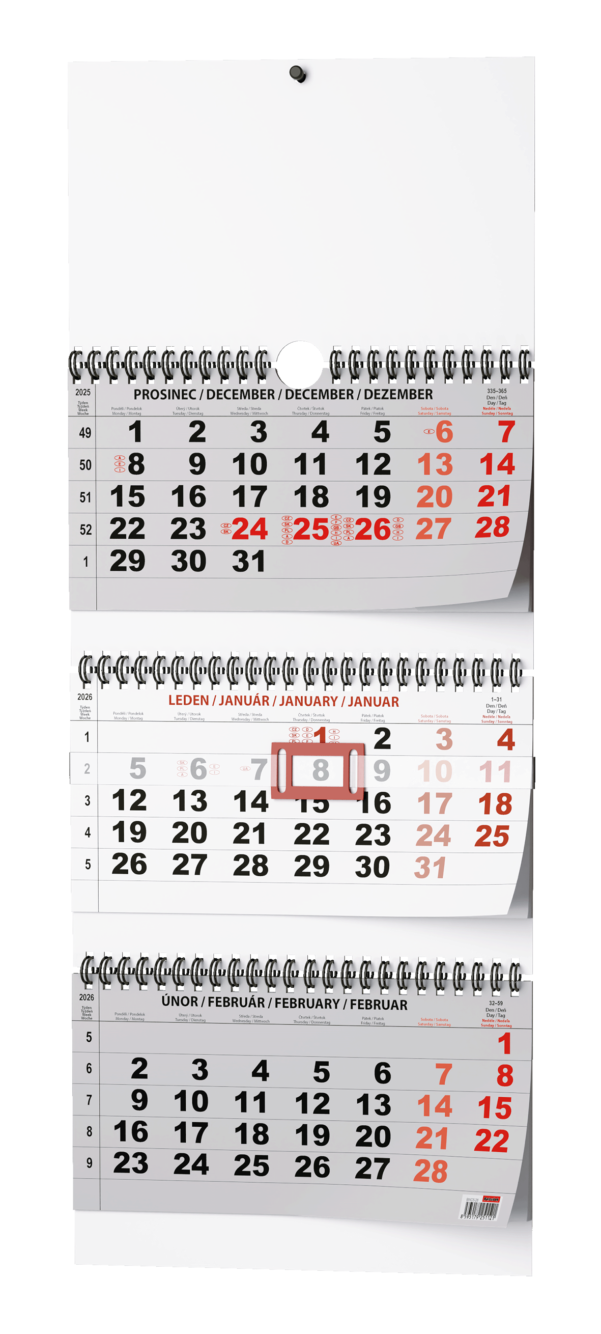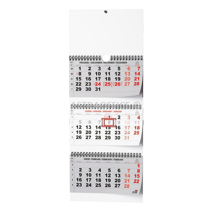 Praktický skládací nástěnný kalendář s tříměsíčním kalendáriem a posuvným jezdcem vhodný do Vaší kanceláře., Papír: ofset, 100 g/m2 Karton je z kvalitní bílé lepenky Součástí je posuvný jezdec z laminovaného papíru, dvojitá kovová spirála "twin wire" s háčkem pro zavěšení Složený kalendář má rozměry 292×180 mm, Kalendárium: Měsíční české, Počet listů: 36, Rozměry: 292x720