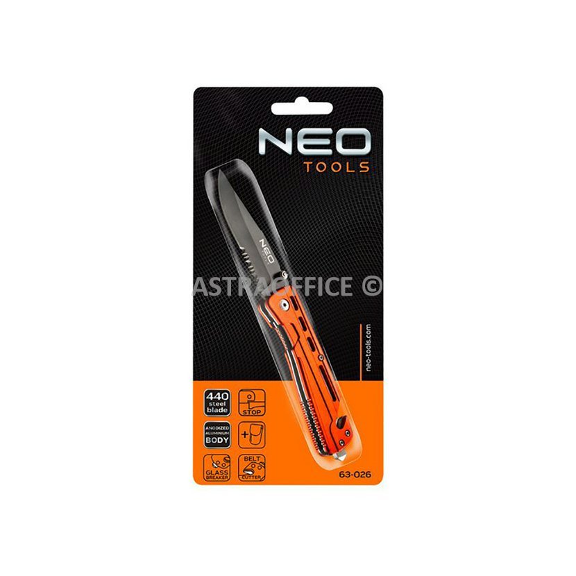 Zavírací nůž Neo Tools, nerezová ocelZavírací nůž se zámkem má čepel z oceli 440 o délce 8,5 cm. Zámek proti neočekávanému uzavření zajišťuje bezpečnost během provozu. Eloxované hliníkové tělo zvyšuje trvanlivost produktu a odolnost proti korozi. Speciální čepel umožňuje řezat pás, což značně usnadňuje uvolnění během nebezpečí v autě. Odolný nylonový kryt pro snadné skladování a přepravu.- zadní části nože lze rozbíjet sklo- čepel má speciální zoubky pro řezání bezpečnostního pásu v autě- funkce stop - zabraní nechtěnému zavření nože při práci- nylonové pouzdroDélka čepele: 8,5 cmnbsp;nbsp;nbsp;