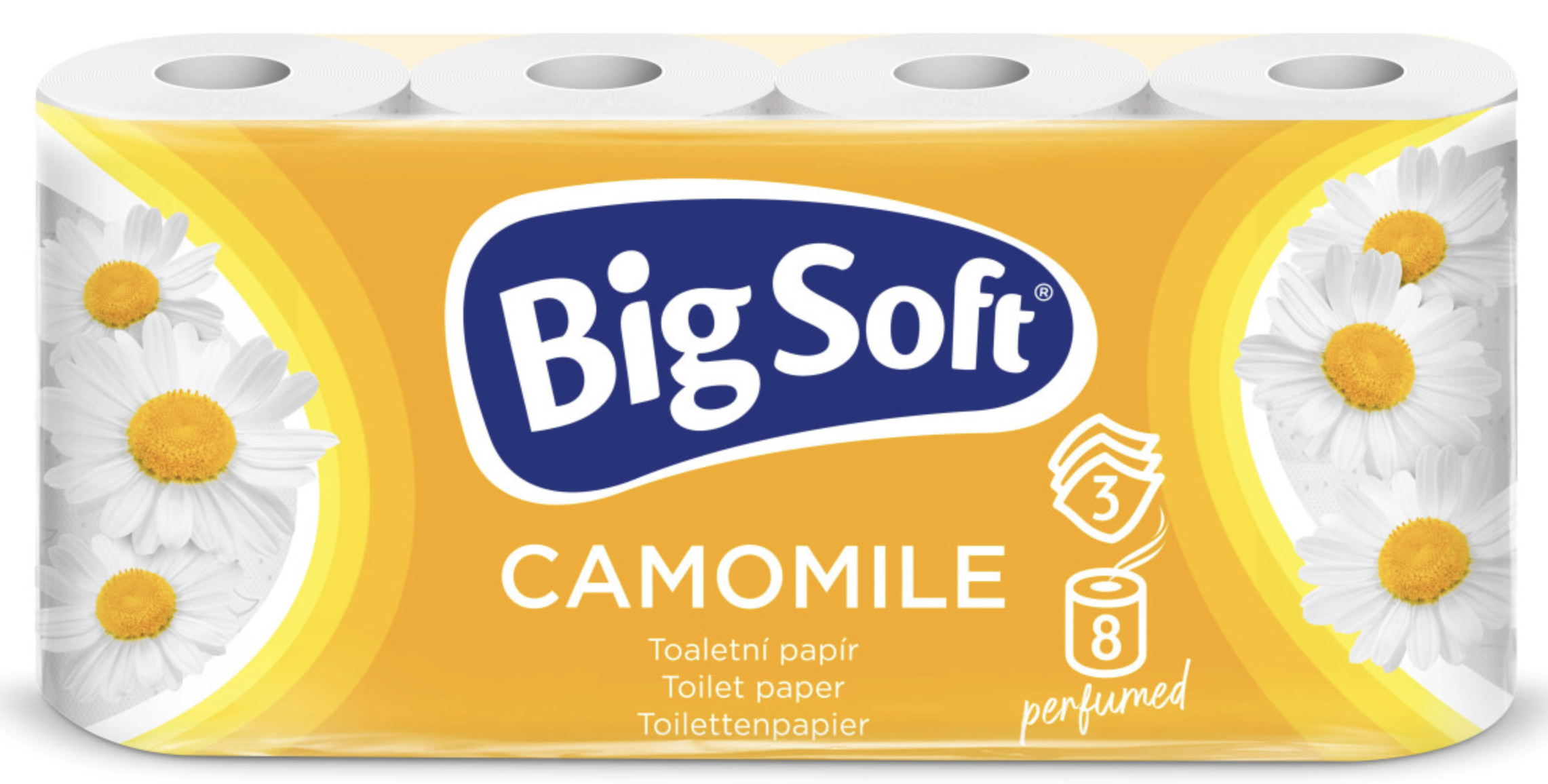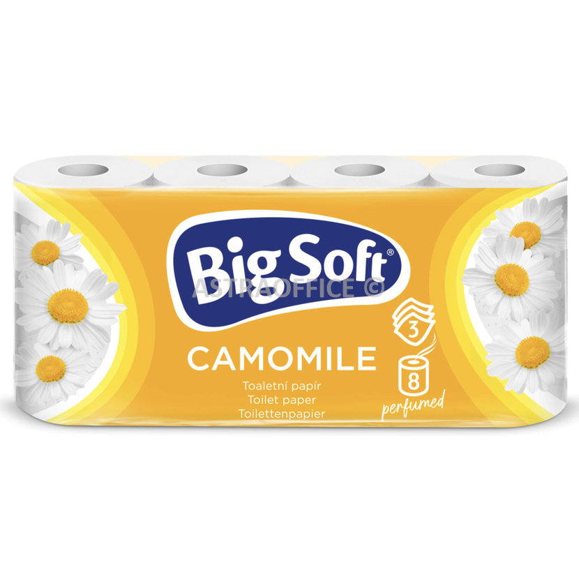 Toaletní papír jemně parfémovaný vůní heřmánku. Díky třem vrstvám a elegantní ražbě je tento papír extra jemný, nadýchaný a zároveň dostatečně pevný. Balení obsahuje 8 ks po 150 útržcích.