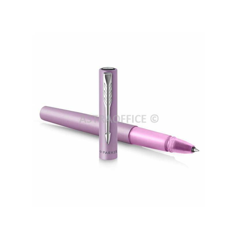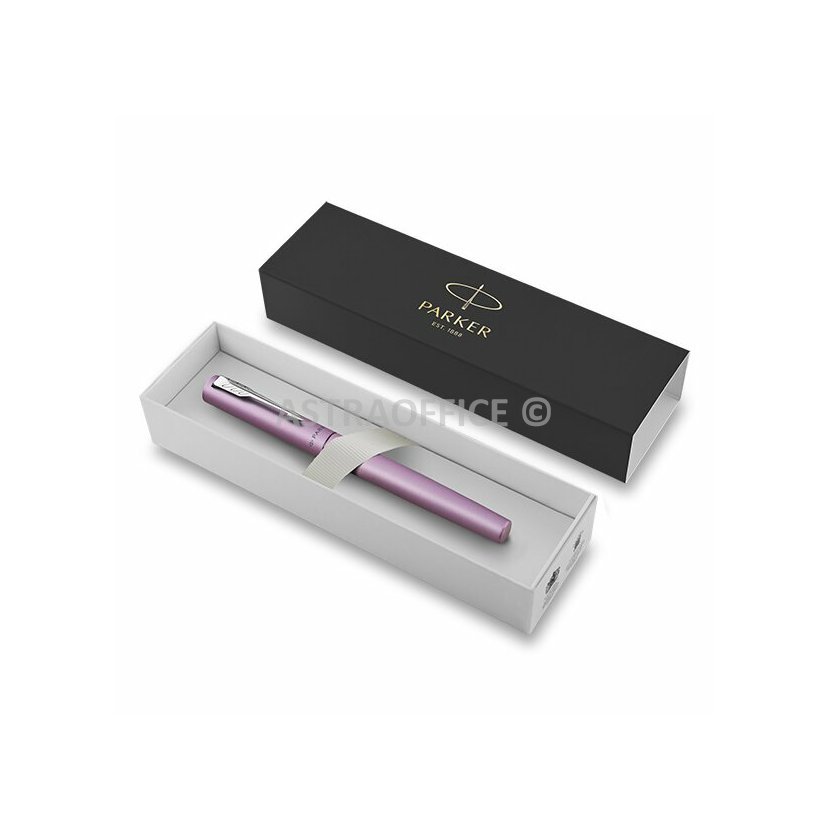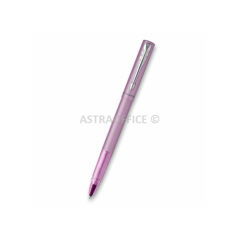 Roller Parker Vector XL s mosazným tělem a víčkem se saténovým metalickým lakem v kombinaci s chromovými doplňky. Úchopová část pera je transparentní. Roller v barvě lilac - šeřík.