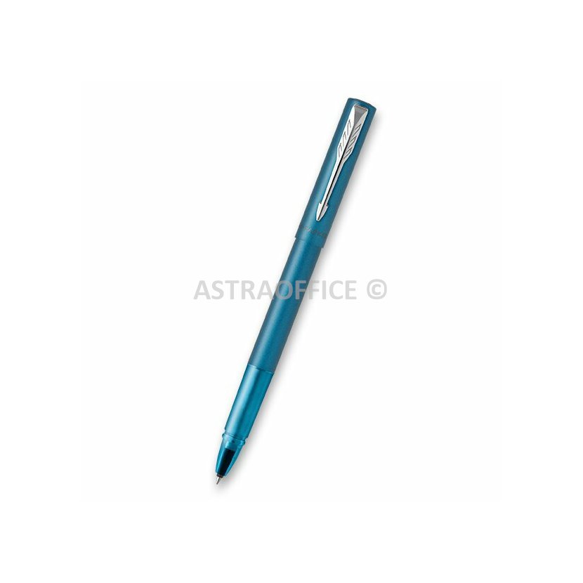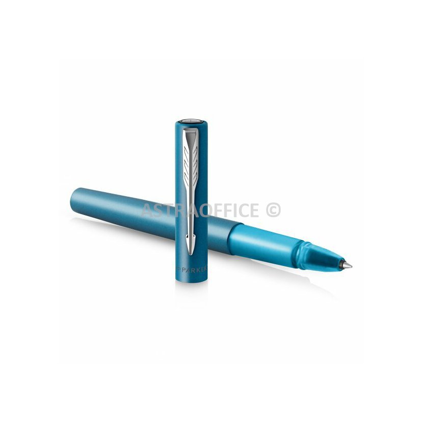 Roller Parker Vector XL s mosazným tělem a víčkem se saténovým metalickým lakem v azurově zelené barvě a v kombinaci s chromovými doplňky. Úchopová část pera je transparentní.