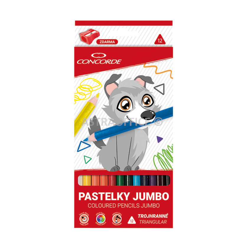 Školní pastelky JUMBO trojhranné, 12 jasných barev. Vyrobené z lipového dřeva, lakované, odolné jádro. Průměr jádra 4mm. Dodávané v papírové krabičce s Volfíkem. Ořezávátko ZDARMA.