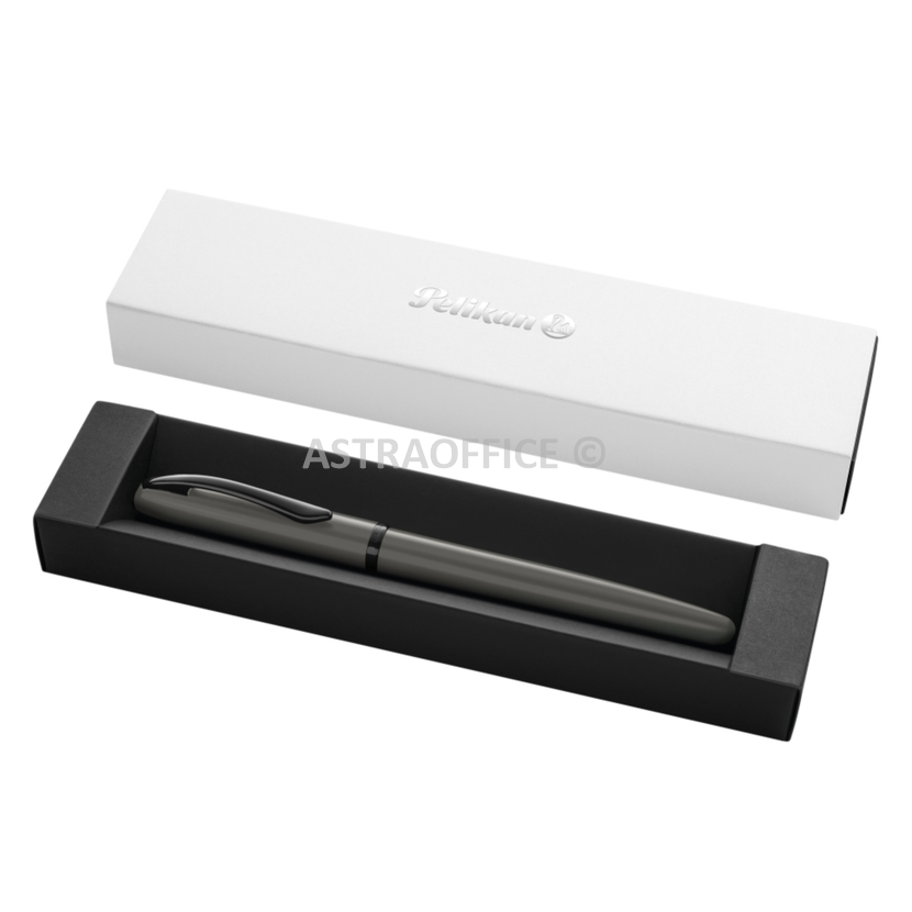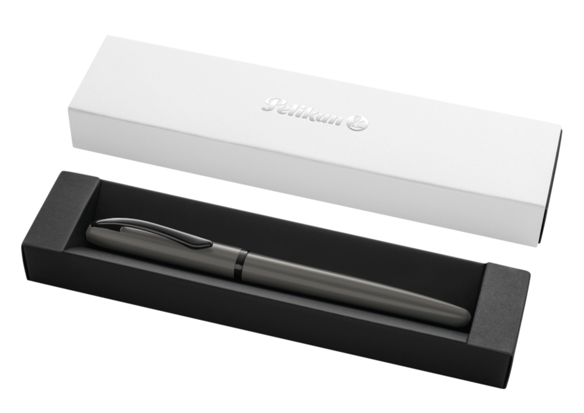 Noble stříbrné Typická spona ve tvaru zobáku Pelikan je odpružená, a proto obzvláště robustní. Roller je vybaven náplní. V boxu.