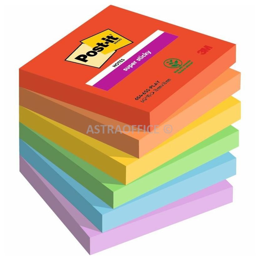 Post-it silně lepicí bločky kolekce PLAYFUL, rozměry 76x76 mm, 6 bločků po 90 lístcích. Barvy: červená, pomerančová, slunečná žlutá, zelená jetelová, nebeská modrá, duhová fialová