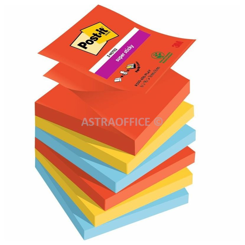 Post-it silně lepicí Z-bločky kolekce PLAYFUL, rozměry 76x76 mm, 6 bločků po 90 lístcích. Barvy: červená, pomerančová, slunečná žlutá, zelená jetelová, nebeská modrá, fialová