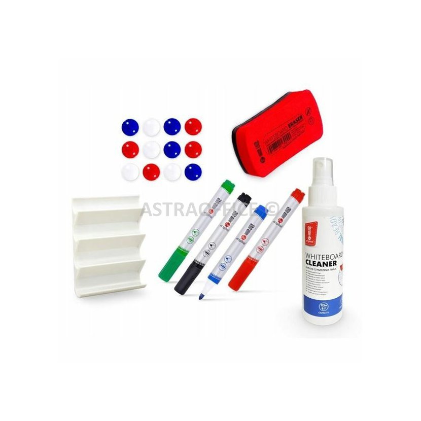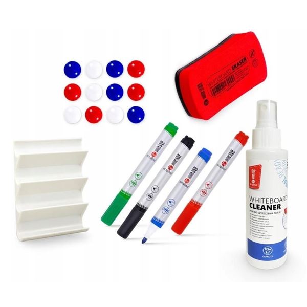 Sada obsahuje základní doplňky k bílým magnetickým tabulím: Obsah: stírací magnetická houba, 12 ks barevných magnetů (průměr 20 mm), 4 ks popisovačů (červená, modrá, zelená, černá), magnetický plastový držák na popisovače, čistící spray na bílé tabule (125 ml)