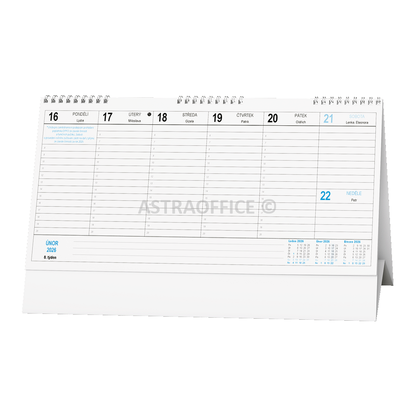 Tradice v novém designu. Oblíbený modrý kalendář s týdenním kalendáriem pro plánování Vašich daní., Papír: ofset, 70g/m2 Obálka: křída lesk 135 g/m2 Stojánek je z kvalitní bílé lepenky 600g/m2 Dělená kovová spirála "twin wire", Kalendárium: Týdenní, Počet stran: 57, Rozměry: 300x150