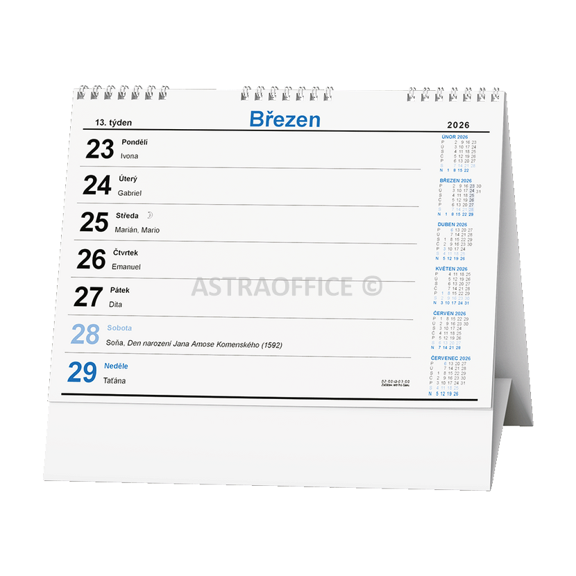 Pracovní kalendář v praktickém formátu a s týdenním kalendáriem. Zajímavý motiv oživí Váš stůl., Papír: ofset, 70g/m2 Obálka: křída lesk 135 g/m2 Stojánek je z kvalitní bílé lepenky 600g/m2 Dělená kovová spirála "twin wire", Kalendárium: Týdenní, Počet stran: 57, Rozměry: 210x150